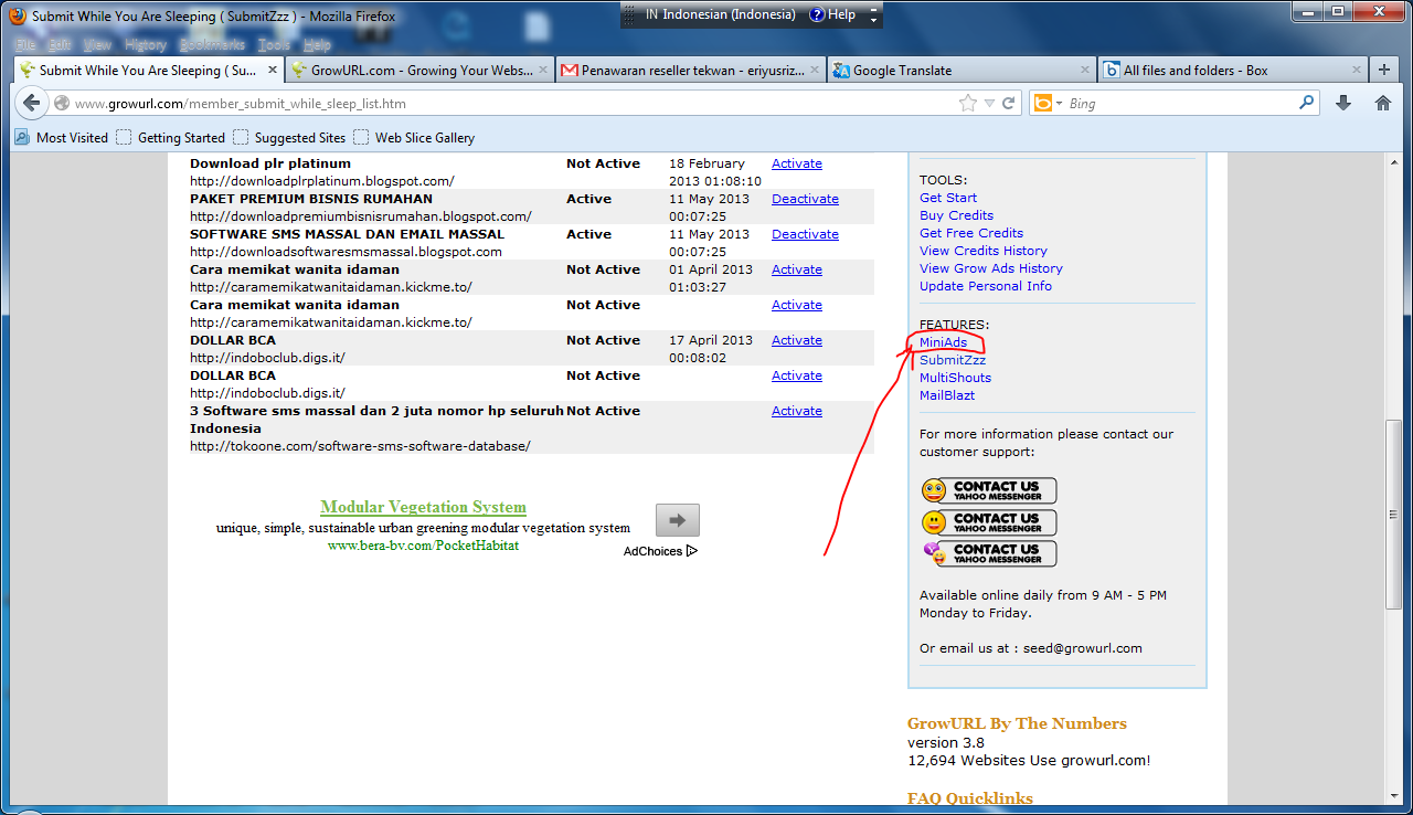 Proses ini sangat memakan waktu dan banyaknya situs iklan baris yang anda masuki akan sangat tergantung dari lamanya masa online anda. GrowURL.com mengatasi masalah anda dengan mempersingkat proses pengiriman iklan dan info, kini tidak saja anda bisa mengirim lebih cepat dan mengirim ke lebih banyak situs iklan baris, anda bahkan bisa bersantai-santai karena fitur pengirim iklan dari GrowURL.com mengirim iklan anda secara otomatis bahkan ketika anda sedang tidur sekalipun! Anda hanya tinggal register ke GrowURL.com, mencari credit dan menikmati waktu luang anda. Tugas anda selanjutnya? Duduk santai, minum kopi dan saksikan iklan situs anda menyebar ke semua lokasi iklan baris dan direktori. Area manakah basis penyebaran iklan GrowURL.com? Saat ini, Indonesia.